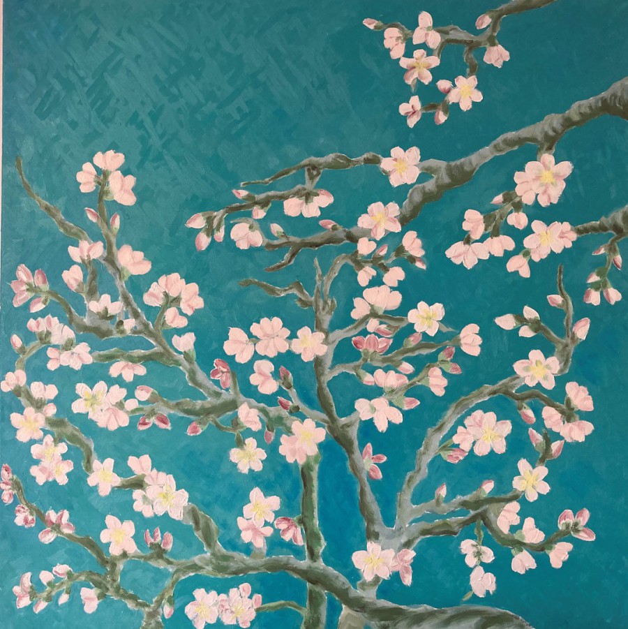 Searched "blossom" on web and one image was Van Goch's "Almond blossom". The back ground colour is inspiring. I had a go! and this picture hangs above my desk and changes throughout the day with the sunlight through the window. I love it and am greatful to be able to do this.
