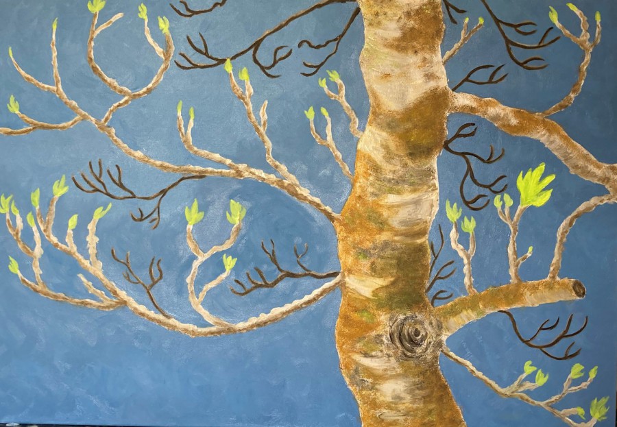 It was a last minute decision and I was painting with oils in July, and 40+ªC, and I have no airconditioning. The paint was drying overnight - absolute learning process but went with the flow! My works were all about how nature is a great teacher in the art of adapting to challenging circumstances. All works were inspired by the nature that surrounds me in Mallorca. The Fig Tree, left, is in the car park opposite my flat and is a survivor of the terrible floods the village of Sant Llorenç des Cardassar had in October 2018. A fig tree is grey and lifeless until suddenly citrus green shoots appear.